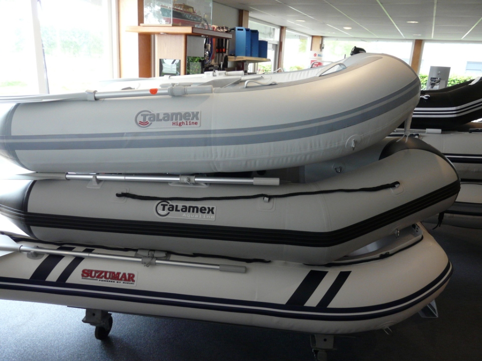 Wij zijn officieel dealer van Talamex rubberboten en exclusief dealer van de Talamex Highline en Silverline en S-line modellen. En ook als verkooppunt van Nimarine, Suzumar en Allpa rubberboten hebben wij een groot aanbod rubberboten vanaf 1.60 t/m 5.00 meter. Beter gezegd, wij hebben de grootste voorraad rubberboten in onze showroom aanwezig voor Lemmer en de WIJDE omgeving. Dus hier slaagt u altijd voor een rubberboot, opblaasboot, Rib en SUP. In diverse uitvoeringen, zoals latten, air deck en alu deck vloeren, aluminium en polyester rompen voor de RIB-modellen (ook in Hypalon).